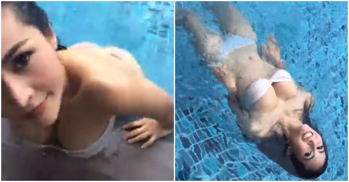 泳池邊捕捉白桃奶妹! 向前彎..「超深溝乳溝」全看光
